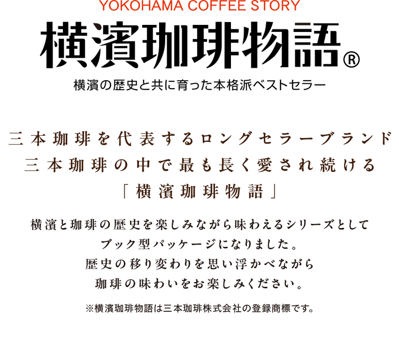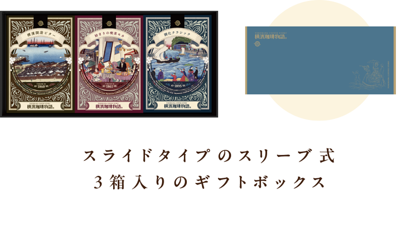 横濱開港ビター(8g×4袋)×1箱、 始まりの喫茶モカ(8g×4袋)×1箱、開花クラシック(8g×4袋)×1箱。