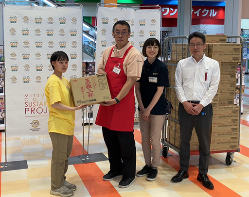この食品寄贈式は、三本珈琲の社会貢献型製品「三本珈琲オリジナルブレンド」の売上の一部を用いて行っており、この費用でダイユーエイトMAX福島店から食品ロスとなりうる食品を買い取り、NPO法人チームふくしまに寄付しました。