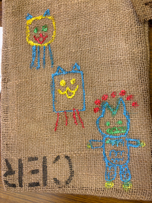 この講座では、コーヒー製造時に発生し廃棄されてしまう麻袋を活用したバックにペイントして自分オリジナルのデザインを行い、参加者は「身近なもったいない」について学んだ後、ペン型のアクリル絵の具を使ってそれぞれ麻袋バックに好きなデザインでペイントを行いました。