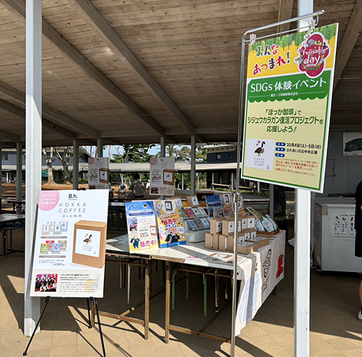 珈琲や軽食の販売、コーヒーブレンド体験やレジンアクセサリー、大人気の麻袋バックペイントなどのSDGs体験のほか、寄付付き商品「ほっか珈琲」の販売も行いました。「ほっか珈琲」は売上の一部がシジュウカラガンの群れの復活に取り組む団体に寄付される寄付付き商品で、取組に賛同いただいた多くのお客様にご購入きました。