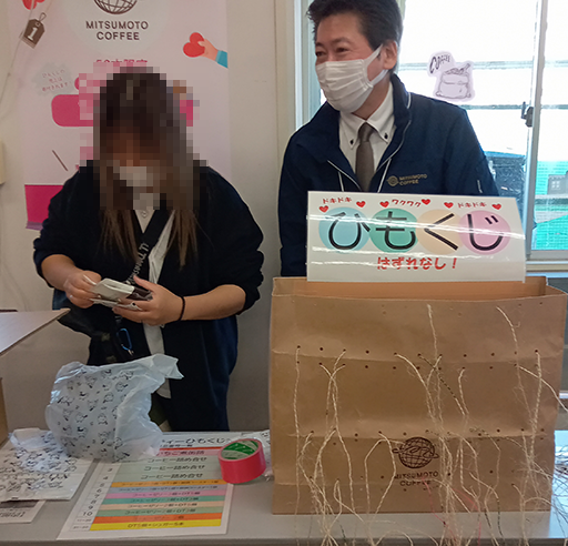 50本用意したひもくじはあっという間に完売してしまいましたが、その後もコーヒーの試飲や販売を皆様にお楽しみいただき、ひもくじの売上は学校活動に寄付させていただきました。