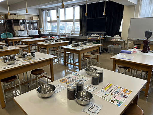 1年生を対象にした講演でしたが皆さん熱心に聞いていただき、最後は実際にもったいないコーヒー豆を使ってオリジナルブレンドを作る体験も行い、コーヒーと食品ロスへの理解・関心を高めていただくきっかけになったのではないかと思います。