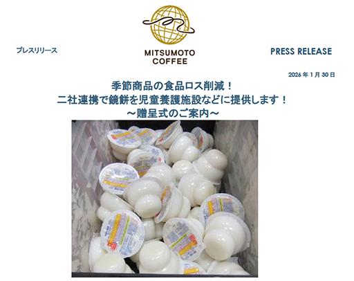この贈呈式は、三本珈琲と生活協同組合コープさっぽろが連携し、コープさっぽろでお正月の飾り物として販売され売れ残った鏡餅約180万円相当を、「トドックフードバンク」を通じて北海道内の児童養護施設などへ提供するものです。